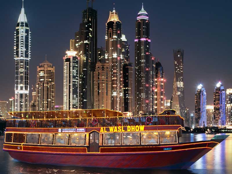 In the evening enjoy Dhow Cruise with Dinner. (07.00 PM- 10.00 PM) A natural salt water inlet in Dubai where you can soak the colorful dotted skyline of Bur Dubai & Deira whilst on board a beautifully decorated dhow. The dhows light up the creek at night along with many prominent sights along the way. Historic sites such as Heritage Village, the well known glittering Gold Souk, The Dubai Chamber of Commerce Building, trading dhows, private yachts, The National Bank of Dubai Building, The Dubai Courts, Creek Hotels along Deira & City Centre Hotels, all provide memorable photo opportunities. Dhow Cruise will enjoy a buffet dinner with soft drinks, however will not receive their glass of wine. Return Back to hotel.
