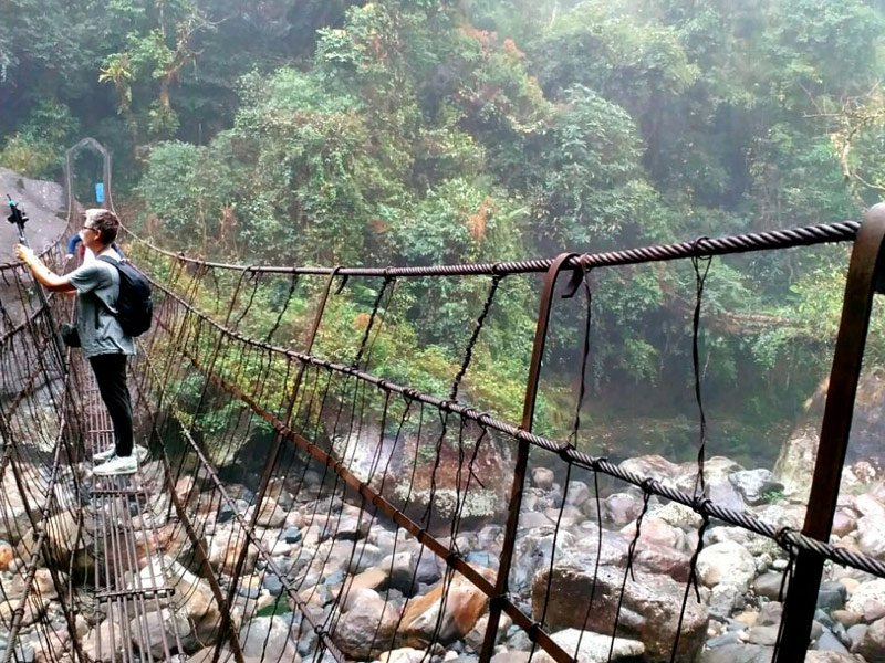 Double Decker Root Bridge and Natural Swimming Pools Duration: Total distance of approximately 10 + 10 km of which 5 + 5 km is by a beautiful mountain skirting road commanding a beautiful view of the valley and through three interesting Khasi villages and can be done by vehicle if anyone wants to save time and energy. This is one of the most beautiful and very popular treks. The high points of this trek are the Double Decker Root Bridge and the natural swimming pools in the river bed. The people of the gorge village Nongriat where the Double Decker Root Bridge is located are very friendly and very special. The trek down stone steps is steep for almost half of the trek down. This trek is open through-out the year and are being used by the villagers of Nongriat, Nongthymmai and Mynteng daily, when it rains and when the sun shines. The steps become slippery during the monsoon months and have to be negotiated with little care to avoid slipping. The rivers in space and streams and waterfalls in full flow during the monsoon months add magnificence to the root bridges spanning these rivers and streams. Contemplate the raw force of nature, when the river is in spate after very heavy rainfall, standing on the Steel Rope bridges strung taut across the river 45 feet above normal water level, . You need to be strong willed and brave. Before reaching the Double Decker Root Bridge you come across more Living Root Bridges and Steel Rope bridges. The valley scenery is very impressive. Beyond the Double Decker Root Bridge you walk on level ground another 2 km (say 20 minutes) to reach Mawsaw Steel Rope Bridge. From here you access our famous natural swimming pools. The larger pool is deep and we recommend only good swimmers to attempt it. The smaller pool can be used by others. However, when the river is in spate please don't attempt swimming. When the flow is normal, you see the bottom of the pools very clearly, so clear is the water. The colour of the water is so inviting for a swim.